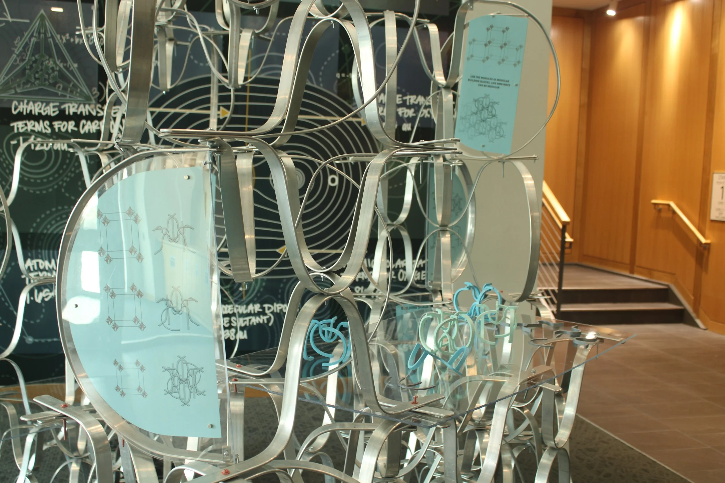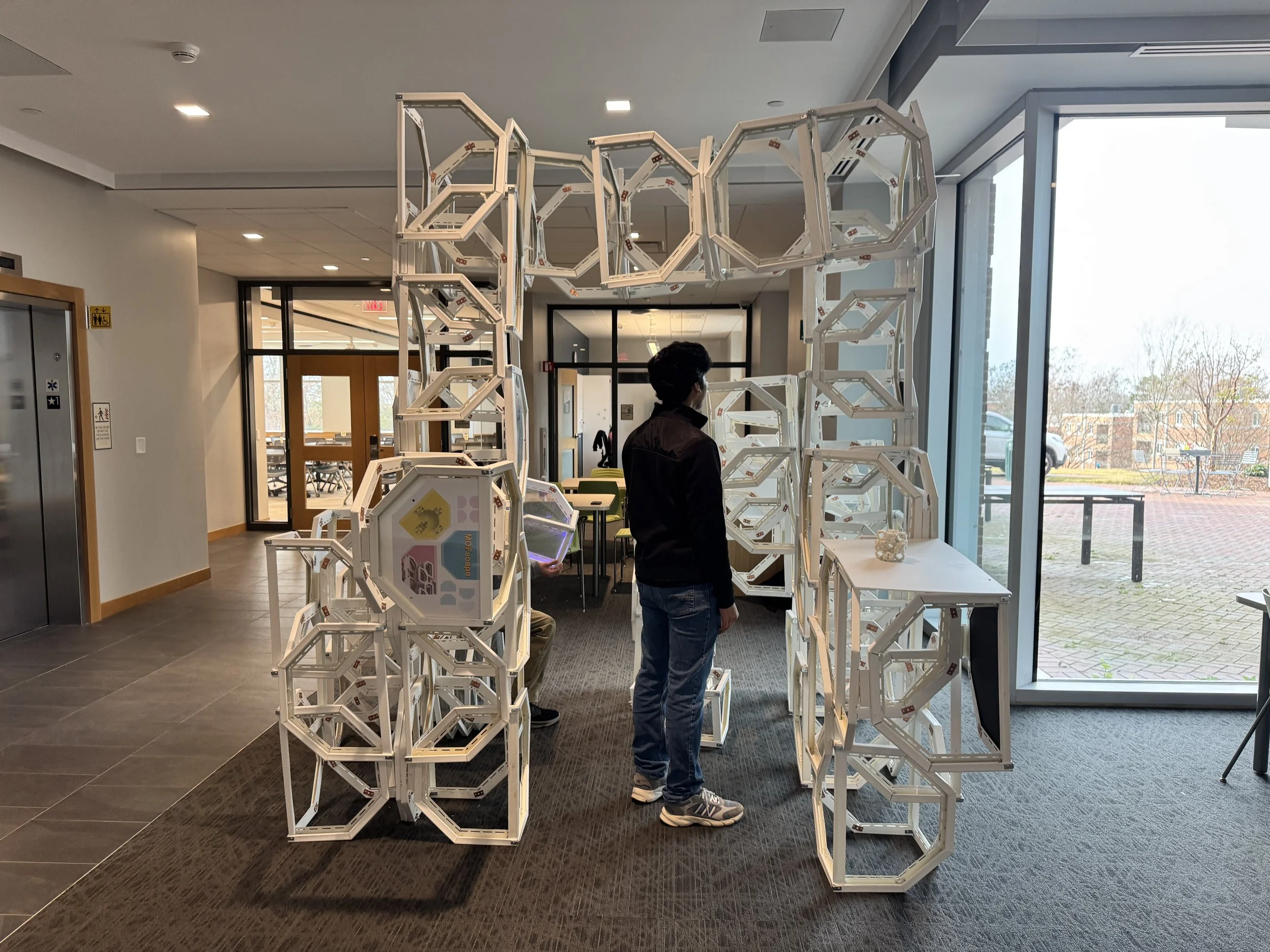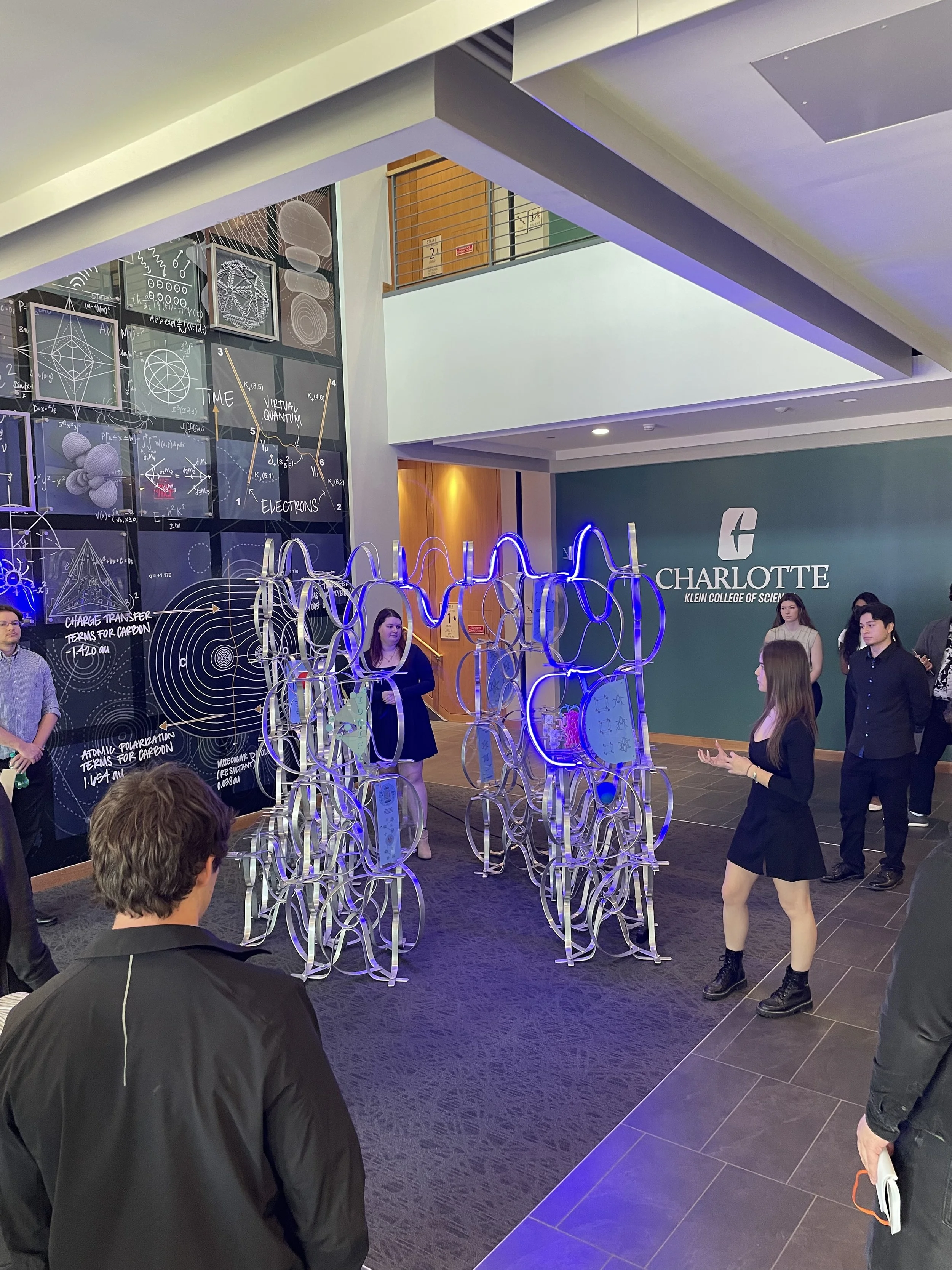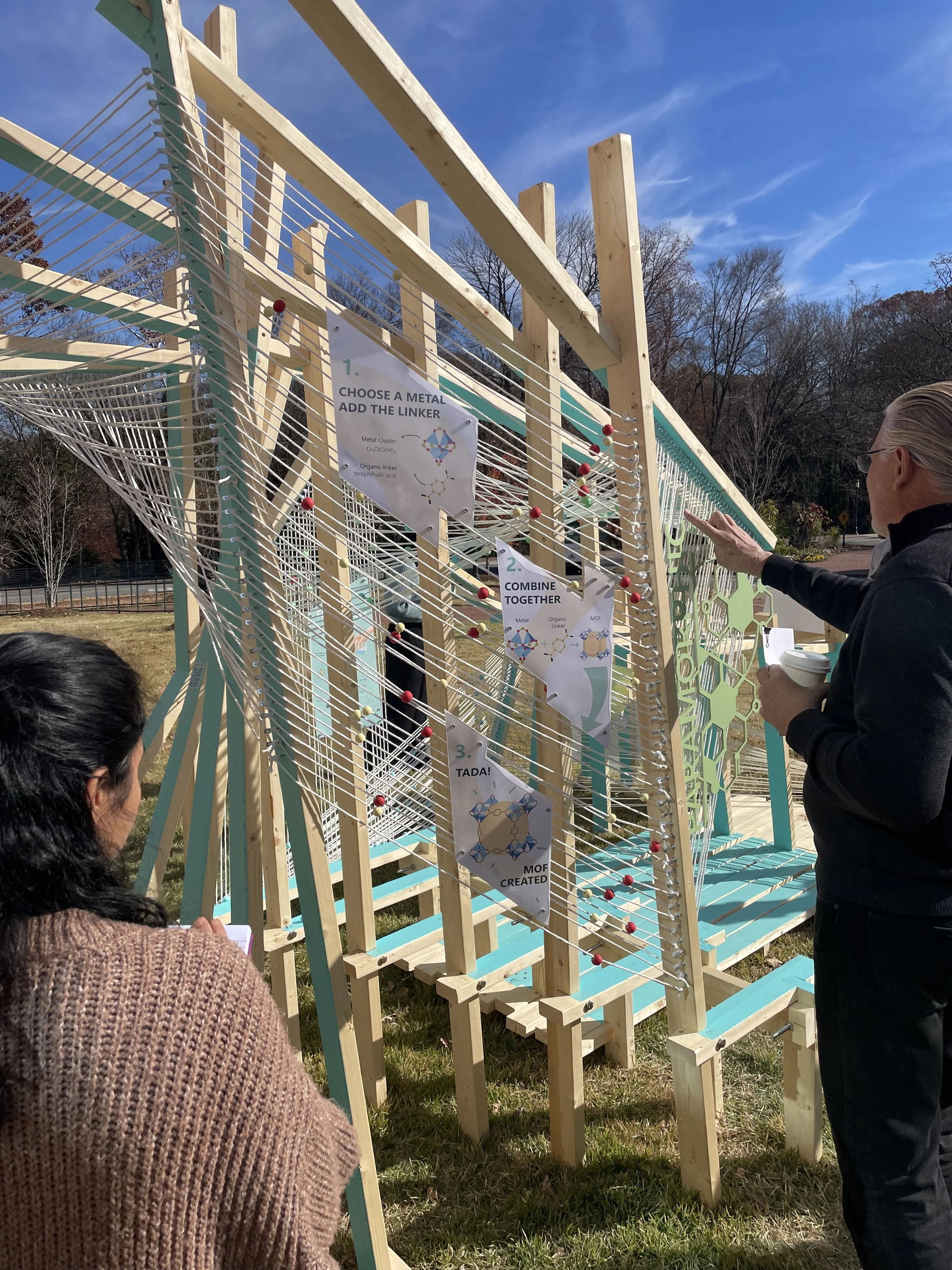 In a collaborative effort between UNC Charlotte departments, students have been exploring the scalability of principles that translate from the nanoscale of chemistry to the macro scale of architecture. As a result, five teams of architecture and chemistry students have designed competition entry proposals for a Nanoscale Science Pop-Up Museum and built full-scale components of their proposals at the Science Building. The installations are based on the design, synthesis, and properties of metal-organic frameworks (MOFs). The projects were on display for viewing and voting on Monday, May 2nd, 2022. The winning project will be built during the 2022-2023 academic year and travel to local K-12 (CMS) schools and community events, transforming the museum from a fixed institution into a transportable community-driven and event-driven organization, democratizing museum attendance by targeting demographic groups less likely to frequent them. The mobile museum will create an atmosphere to enliven urban gatherings and local school events alike.