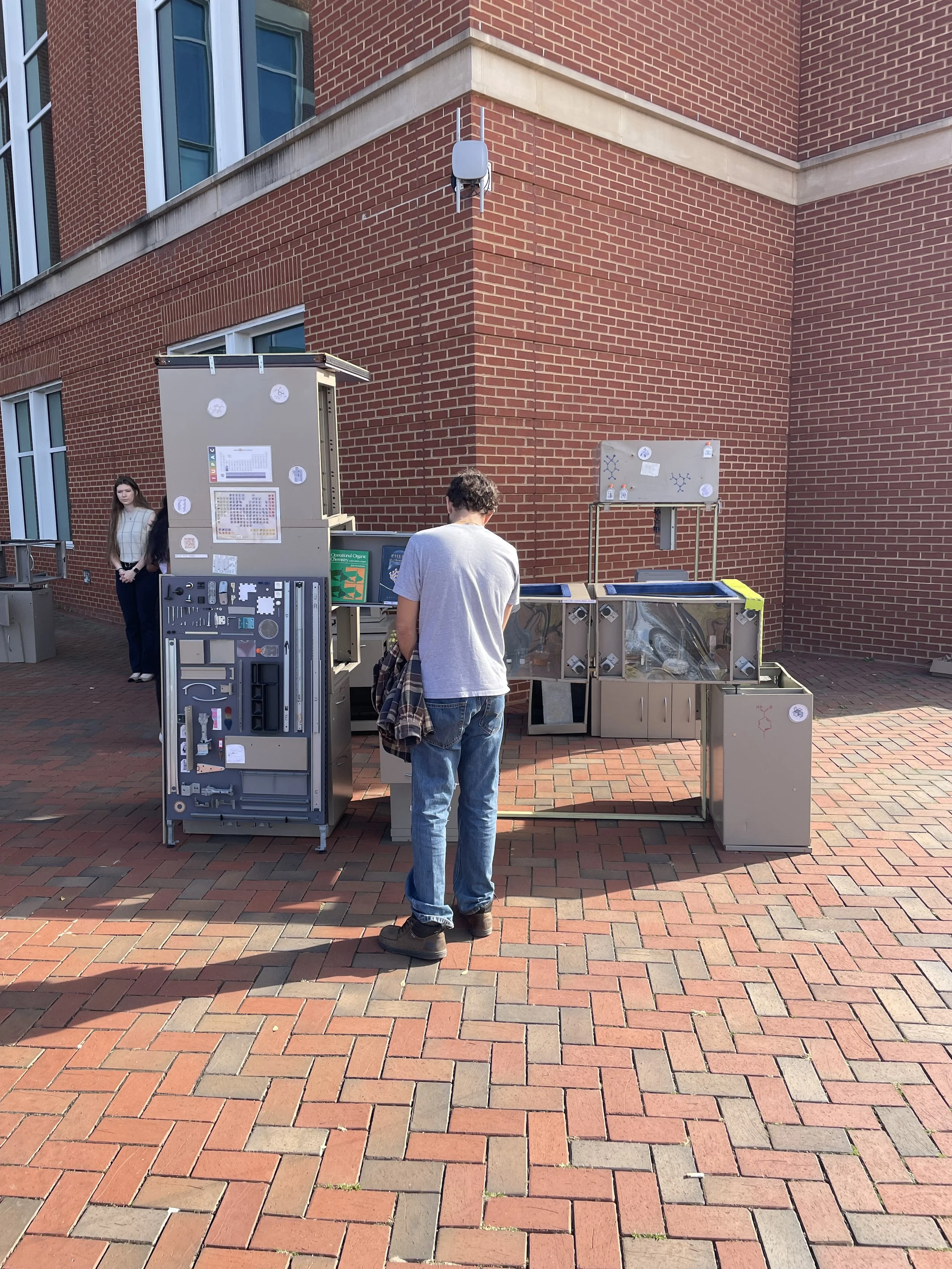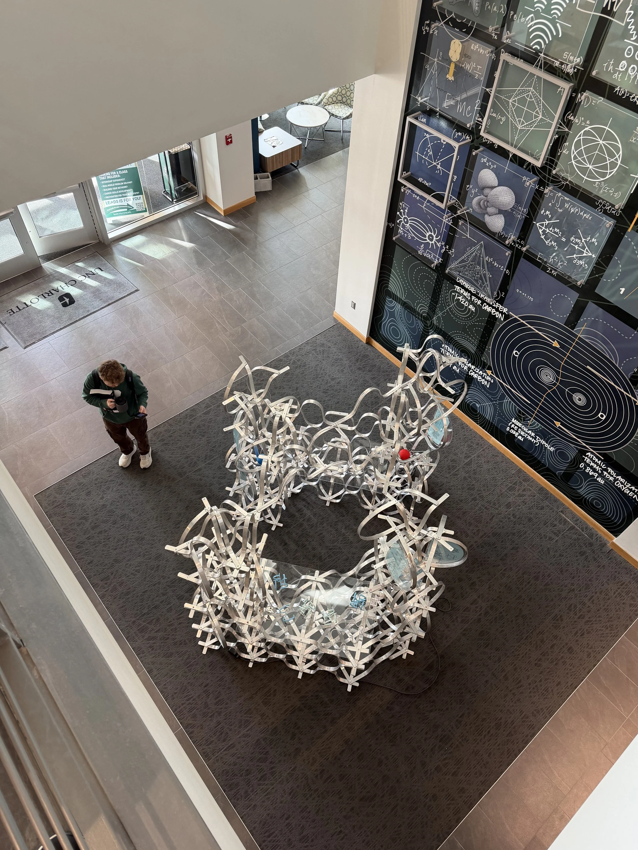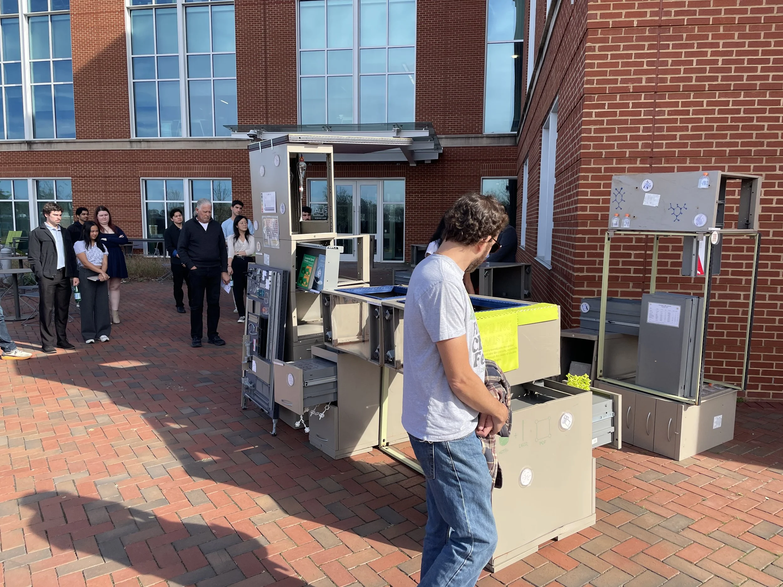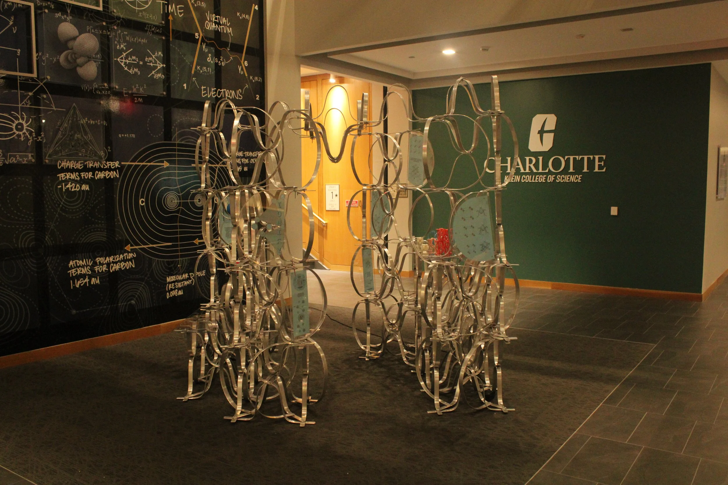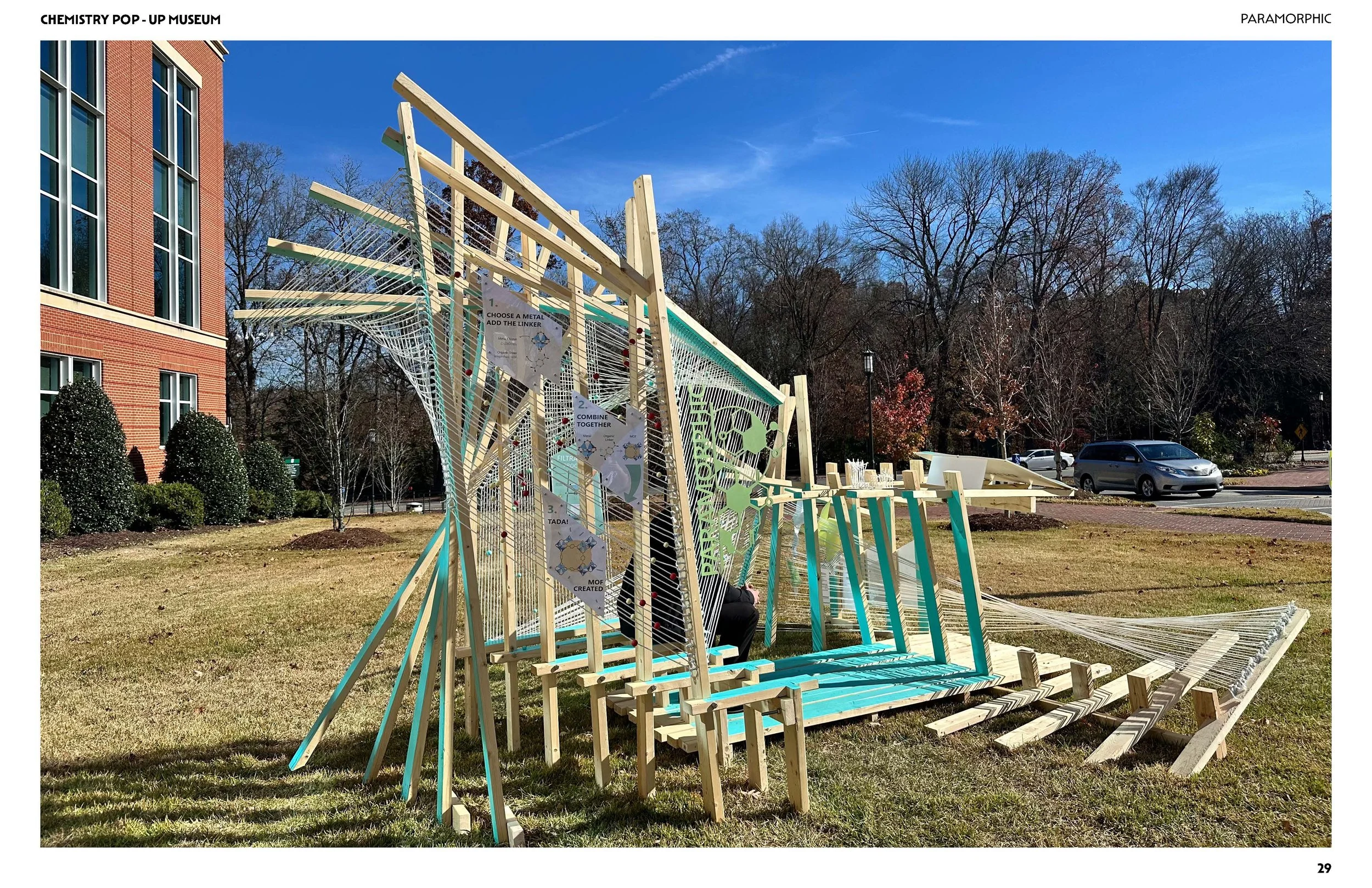 In a collaborative effort between UNC Charlotte departments, students have been exploring the scalability of principles that translate from the nanoscale of chemistry to the macro scale of architecture. As a result, five teams of architecture and chemistry students have designed competition entry proposals for a Nanoscale Science Pop-Up Museum and built full-scale components of their proposals at the Science Building. The installations are based on the design, synthesis, and properties of metal-organic frameworks (MOFs). The projects were on display for viewing and voting on Monday, May 2nd, 2022. The winning project will be built during the 2022-2023 academic year and travel to local K-12 (CMS) schools and community events, transforming the museum from a fixed institution into a transportable community-driven and event-driven organization, democratizing museum attendance by targeting demographic groups less likely to frequent them. The mobile museum will create an atmosphere to enliven urban gatherings and local school events alike.